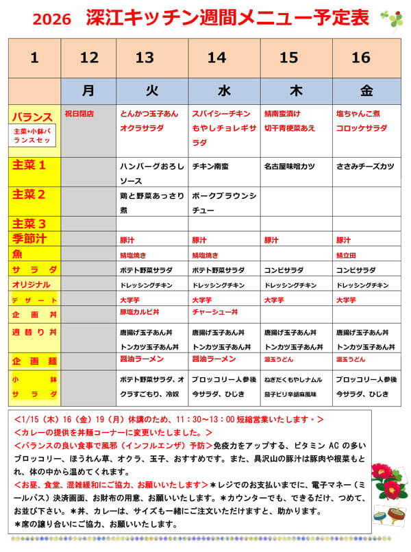 1/12〜1/16 深江キッチン週間メニュー予定表