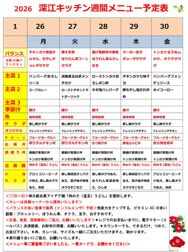 1/26〜1/30 深江キッチン週間メニュー予定表