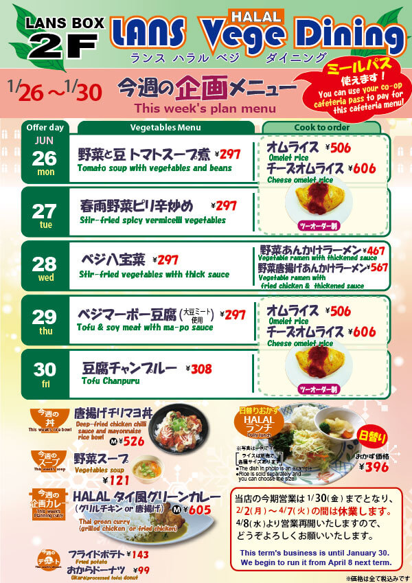 1/26〜1/30 今週の企画メニュー
