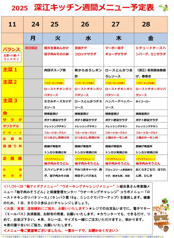 深江キッチンの1週間のメニューを一覧で掲載しています。