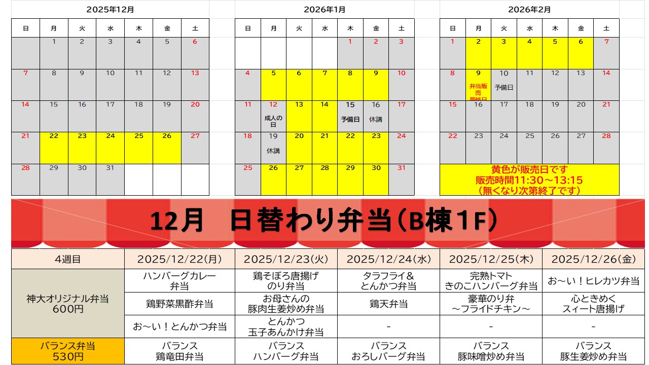 休業期間中、学生・教職員の皆様に昼食をご提供できるよう、生協手作り弁当の販売を実施いたします。